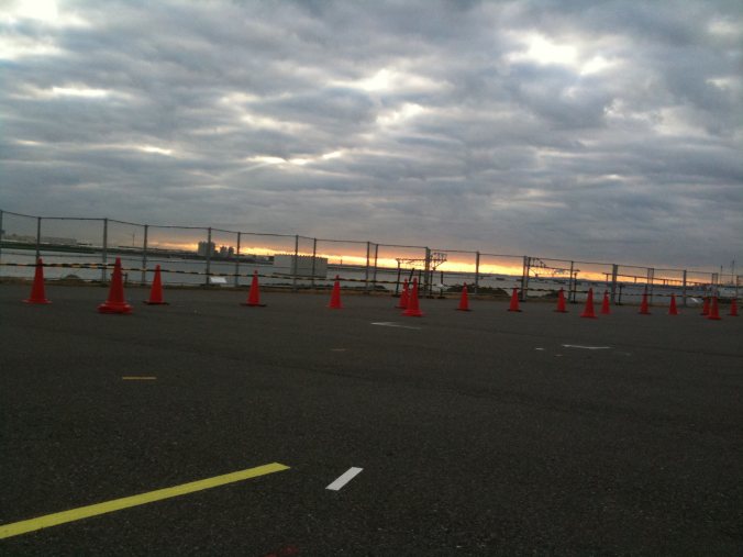 東側の待機列合流直後(7時半過ぎ頃)に望む朝焼け。いや、曇ってるんですけどね。