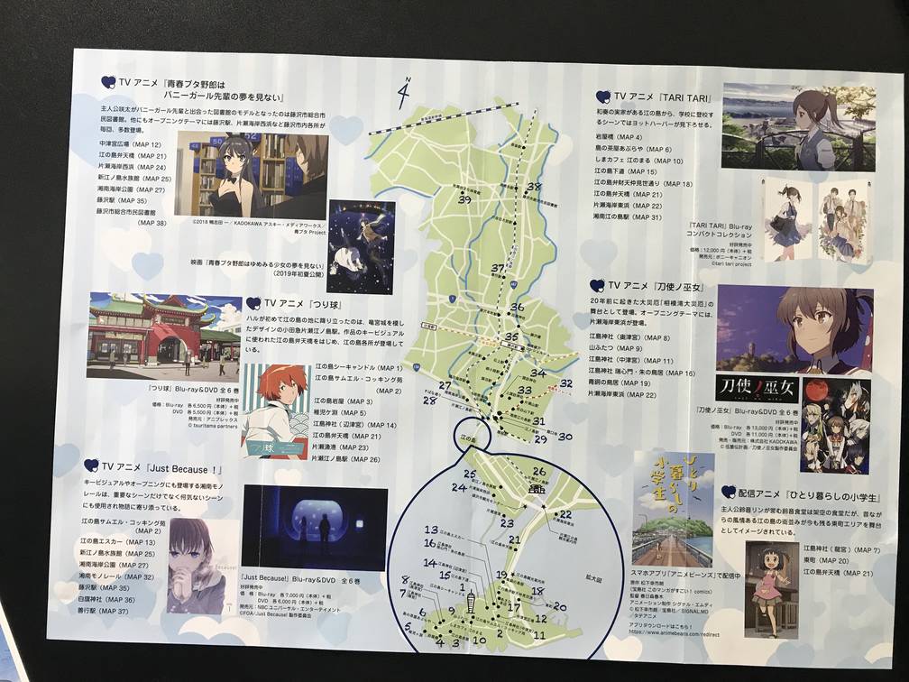 アニメツーリズム協会で展示していた、江ノ島周辺のアニメ舞台マップ。