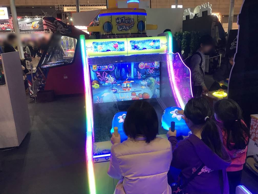 つい気になったのは、小さいお子さん向けの、実際に水が出る水鉄砲を使ったシューティングゲーム。発射した水は、ちゃんとある程度循環しているらしい。循環しないと、発射した水の行き先が無くなるので当たり前かも。また、画面が濡れて見辛くなったしないのかと聞いてみたら、意外とそんなことも無いんだそうな。