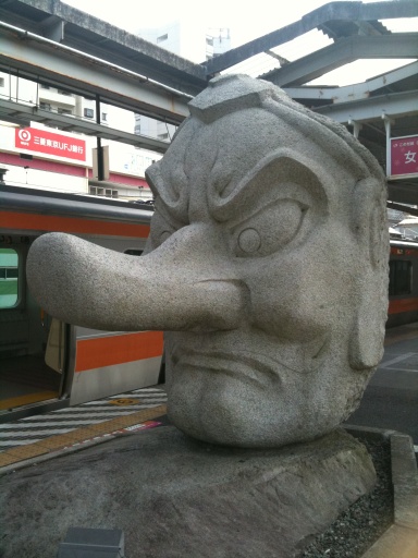 八王子市の高尾駅にて。中央線ホーム内の天狗の石像。