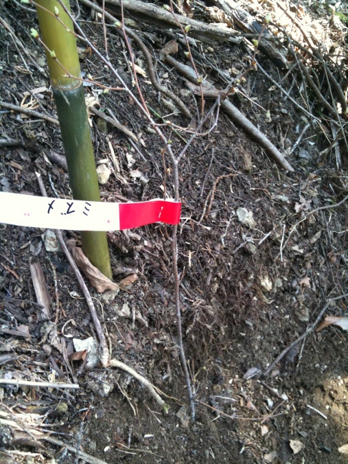 苗木は細いから分かりにくいですが、「ミズメ」のタグが付いているやつです。
