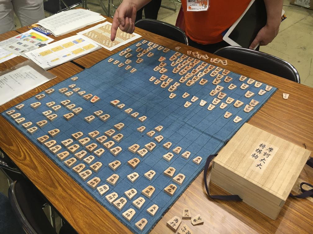 ゲームマーケットで撮ってきた、摩訶大大将棋の様子です。駒多すぎぃ。