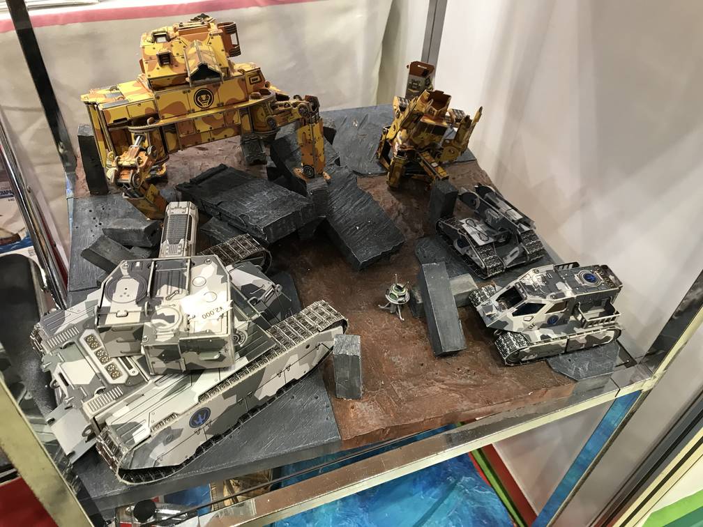 写真はミリタリー寄りですが、城や船、橋やウェスタンな街並みなどいろいろなジャンルのペーパークラフトが用意されていました。紙製といえど印刷はリアルで造形はこまやか。WARHAMMERなどのミニチュアゲームのテレインとして利用できそうです。