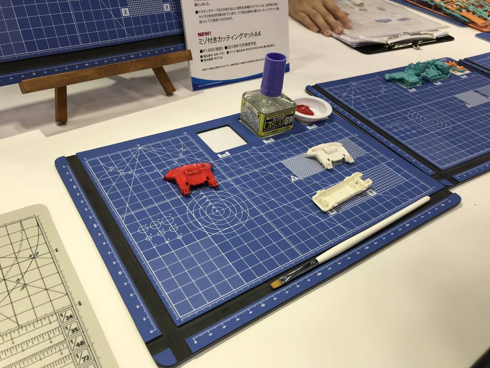 名前通りのミゾや、塗料皿などを合わせられる窪みが付いたカッティングマットですね。写真のように筆が転がらないように置いておいたり、ランナーの切りカスをミゾに落としてまとめて置いたりする模様。地味に便利そう。