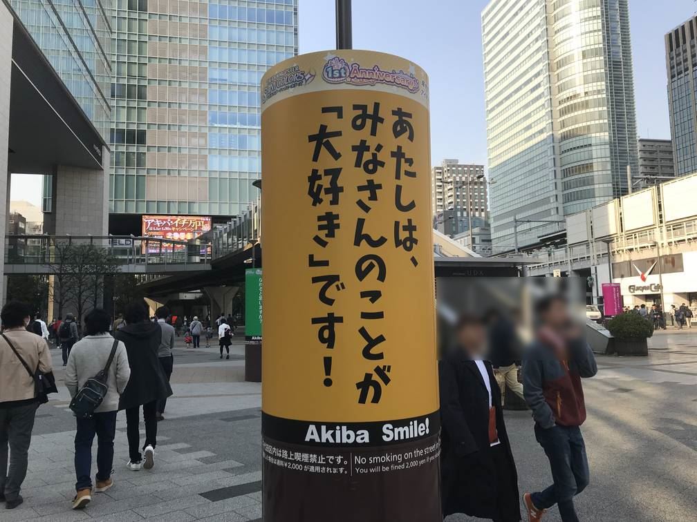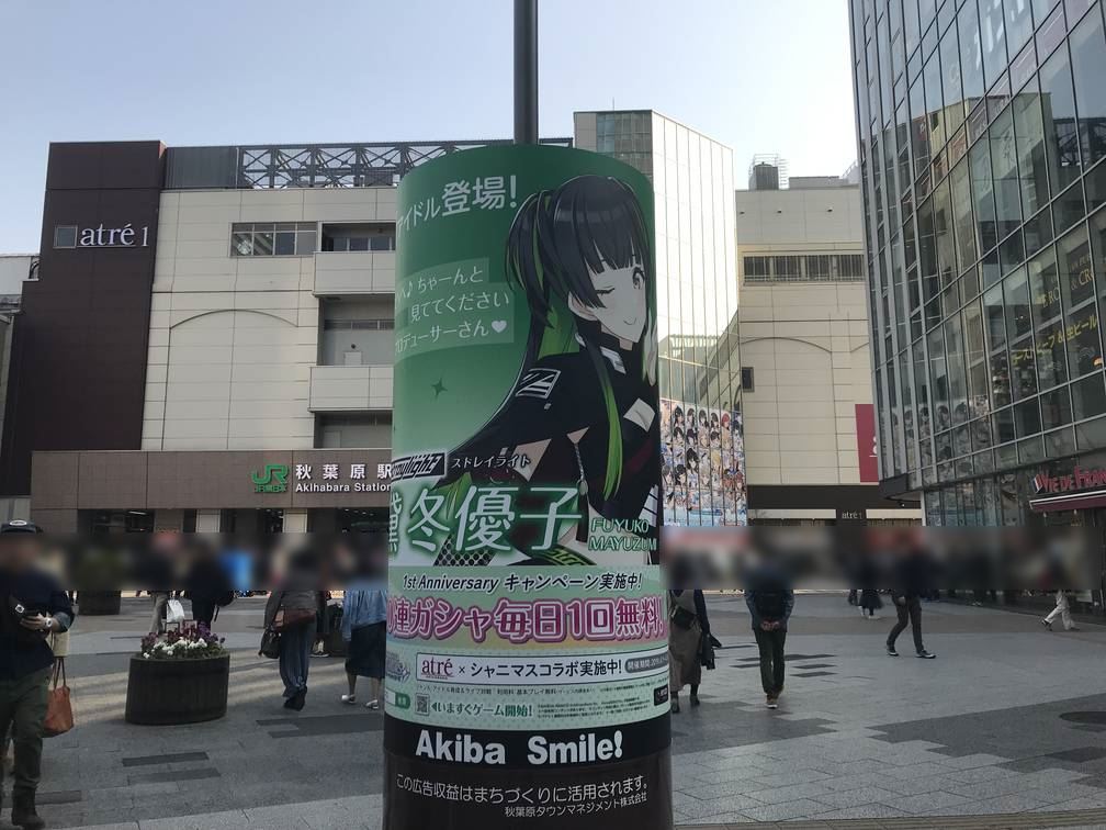 アトレ秋葉原の1階~3階にスタンドポップや衣装、4コマや各キャラの思い出アピール演出の映像展示と特別ショップ。そして電気街口のUDX側の広場にある柱は、各キャラのイラストやセリフで飾られていました。