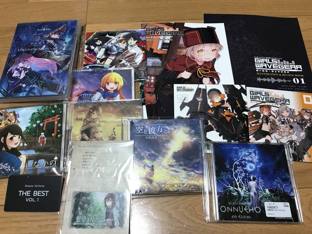 今回の購入物。右上はDAWプラグイン擬人化本&楽曲という、珍しい一品。